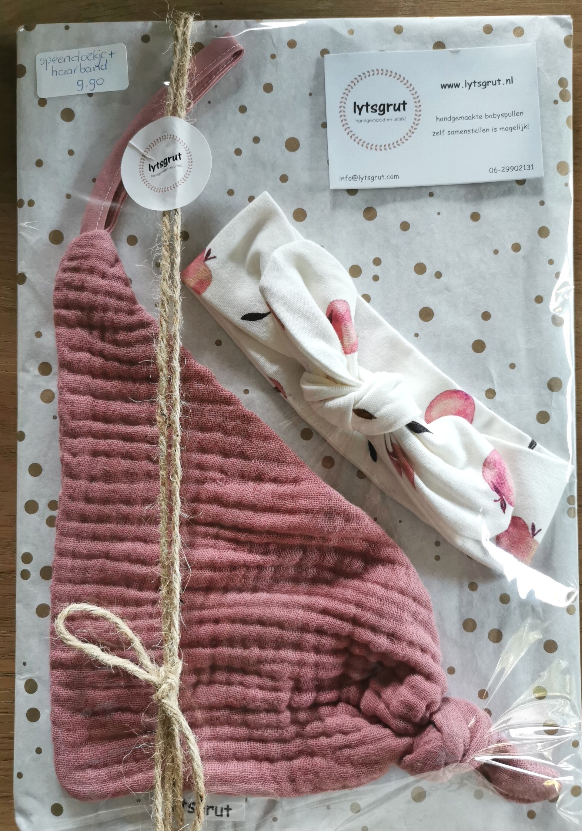 Deze set bestaat uit een speendoekje met knoop, van oudroze hydrofiel met een tricot strik-haarbandje appeltjes in roze.