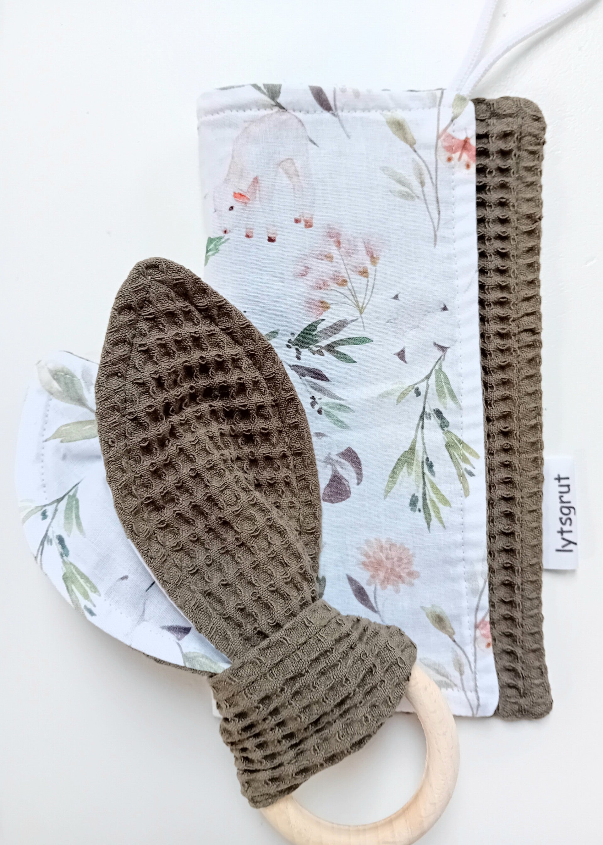 Dit setje bestaat uit een speendoekje en een bijtring met oortjes. In 1 van de oortjes zit knisperfolie.