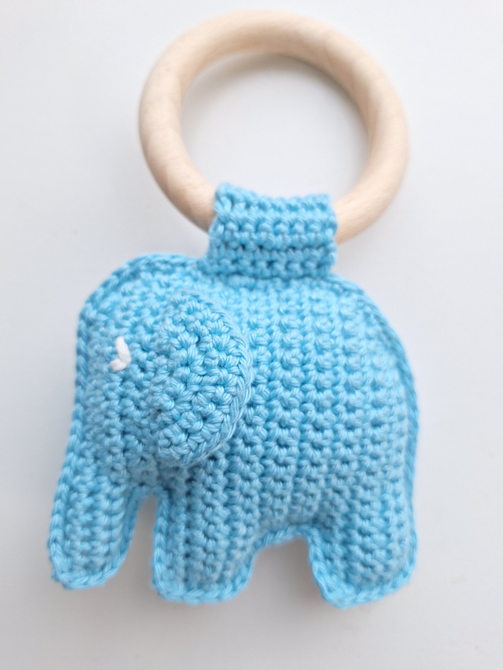 In het olifantje zit een rammelkraal. Het is dus een bijtring en rammelaar in één!