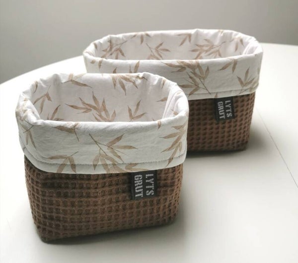 Gemaakt van wafelstof taupe in combinatie met katoen in bamboeprint.