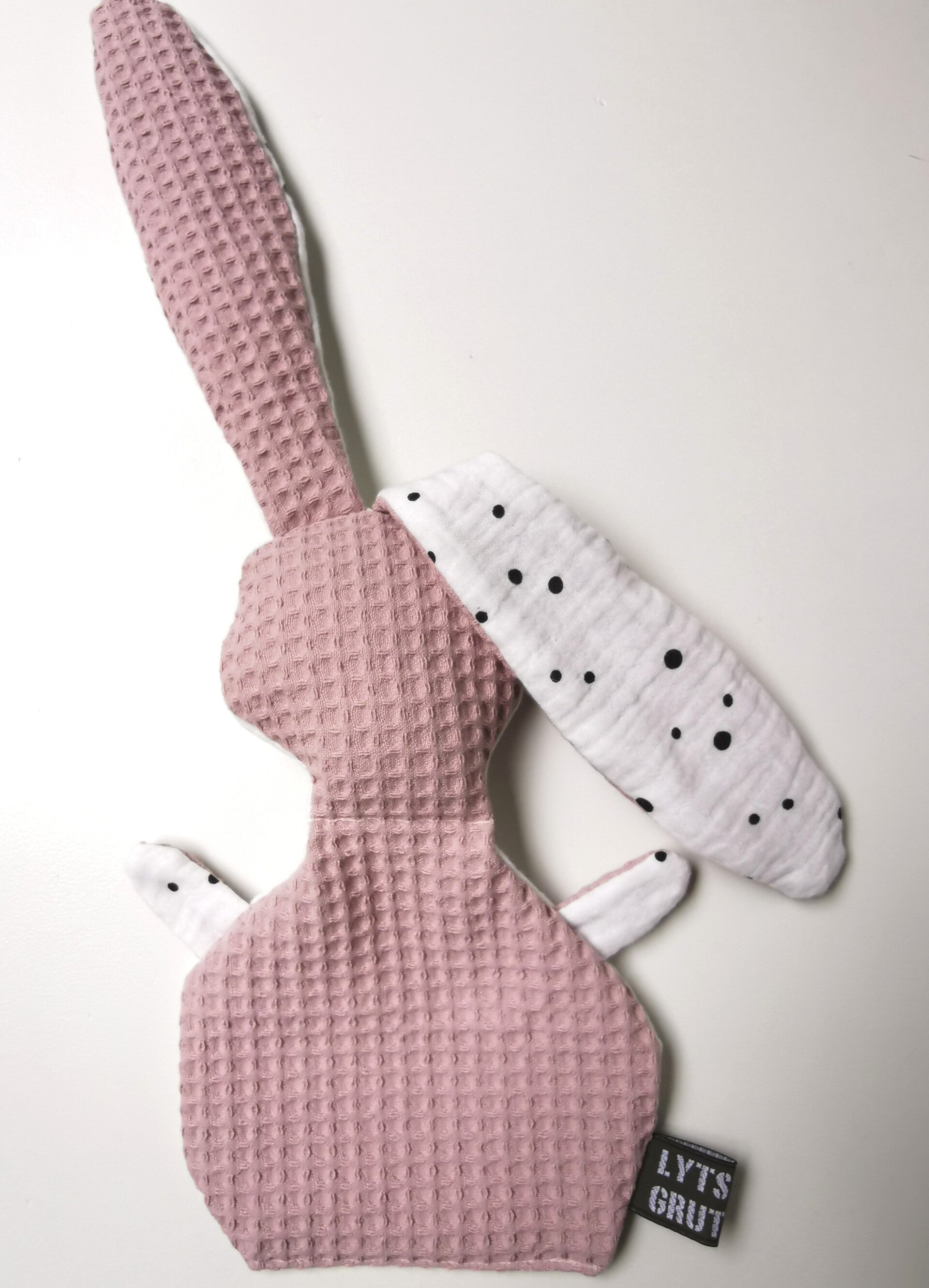 Dit knuffelkonijn is gemaakt van wafelstof donker oudroze in combinatie met hydrofiel stip.